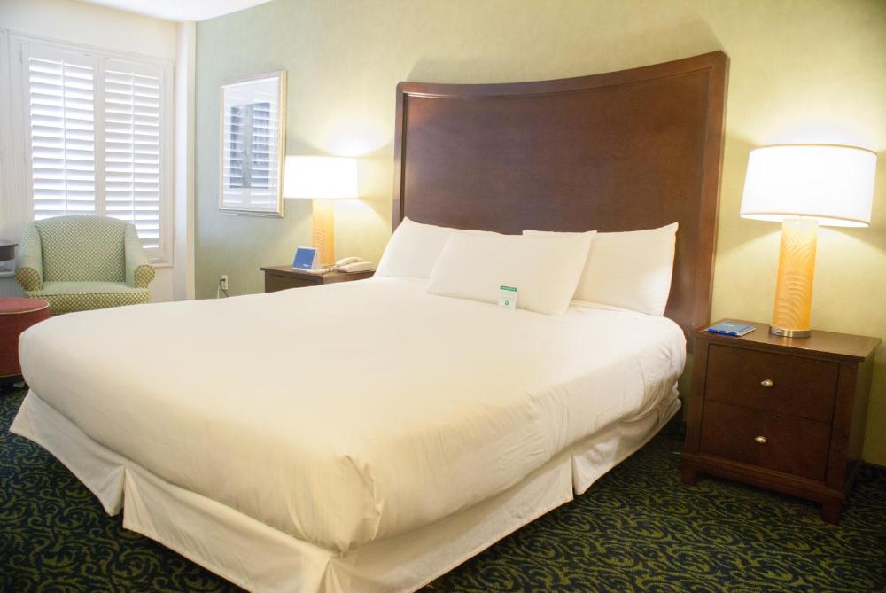 This room features a flat-screen cable TV, a refrigerator, a clock radio, a hairdryer, and an iron and ironing board.